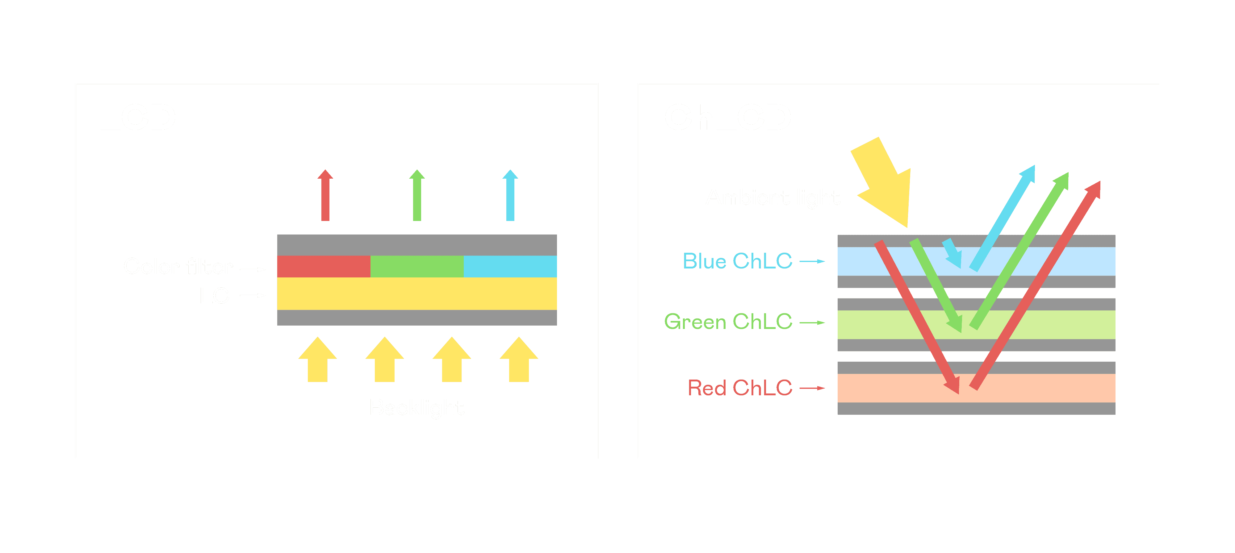 ChLCD 胆固醇液晶就如同纸张一样,,,透过反射环境光来显示影像,,,因此长时间观看不易造成人眼视觉疲劳,,,可达到护眼效果。。。当处于户外阳光下使用,,,LCD 影像容易失真而不易观看,,但胆固醇液晶仍可维持较佳的影像品质。。。。