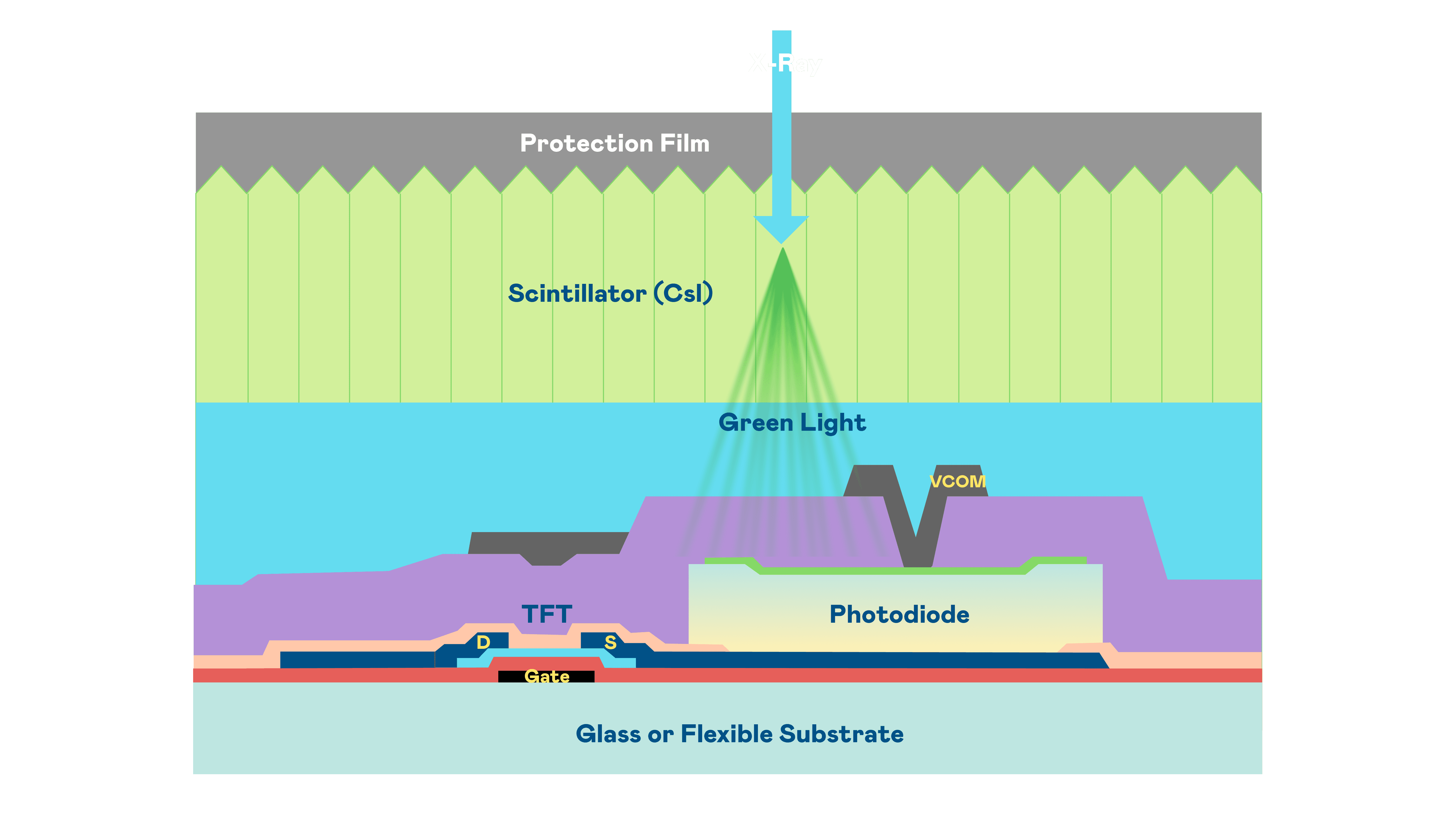 优游UB8的X光影像感测阵列使用薄膜电晶体 (TFT) 作为每个像素的读取开关,,搭配光电二极体(Photodiode)的光电转换元件,,,,用以感测X光影像讯号。。。。